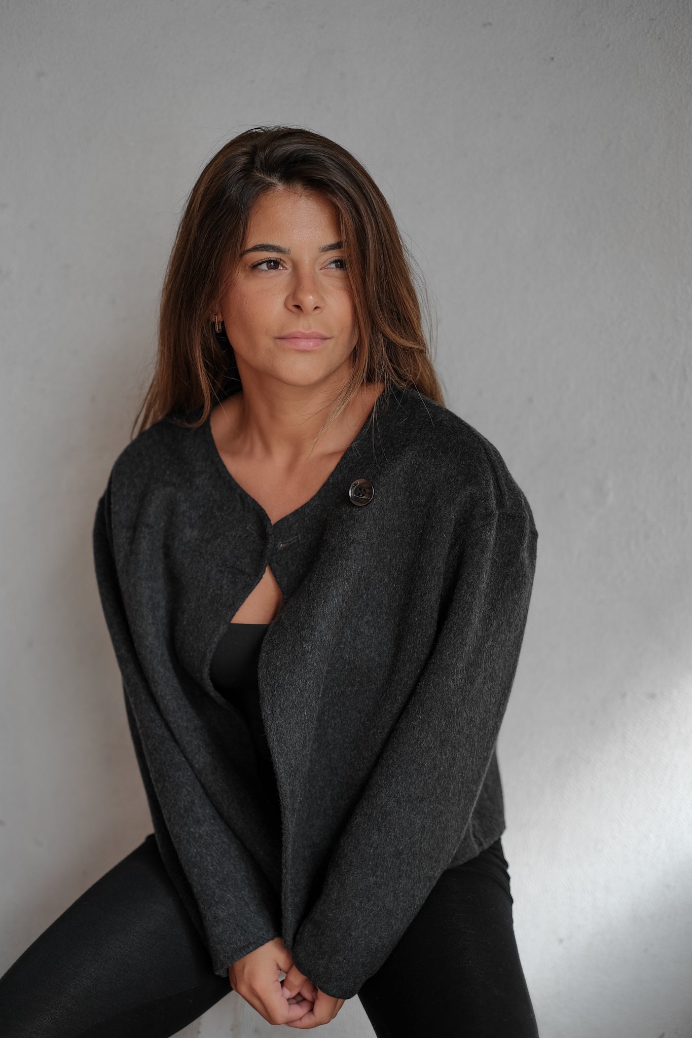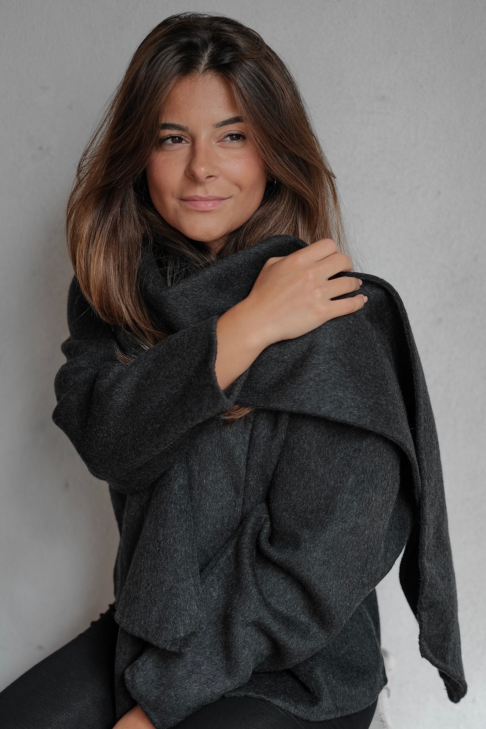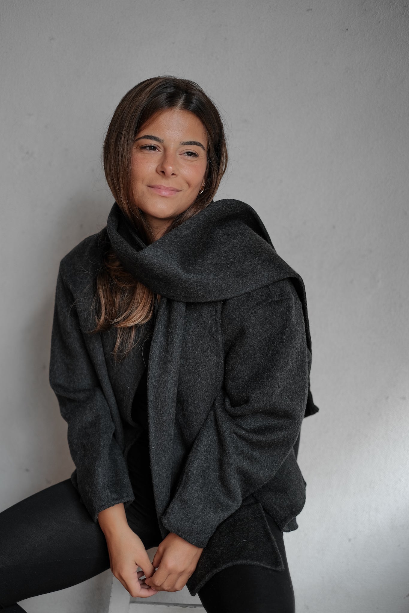 wool scarf coat in dark gray